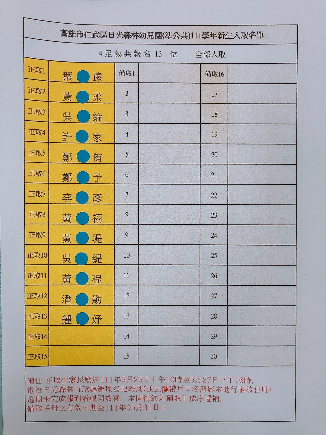 《新生公告》111學年度新生抽籤結果-4歲班名單(正取、備取)