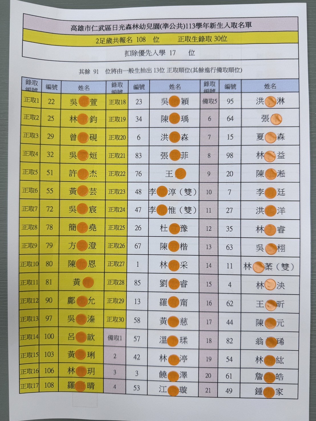 《招生公告》113學年度 新生抽籤結果:正取、備取名冊-2足歲班